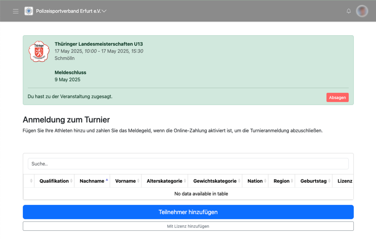 - Füge Sportler und Sportlerinnen deiner Meldung hinzu, indem du auf "Teilnehmer hinzufügen" klickst.