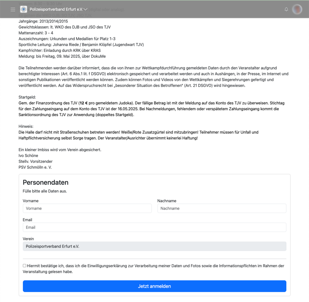 Über DokuMe lassen sich auch Meldungen zu Wettkämpfen durchführen. Der Vorteil dabei ist, dass gleich eventuell benötigte Lizenzen (z.B. Wettkampflizenz, Beitragsmarke, Mindestgraduierung) bereits im Voraus überprüft werden können.