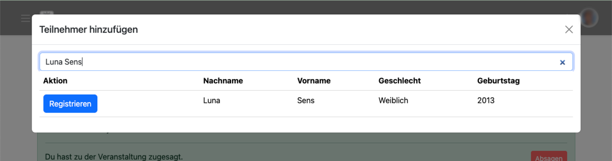 - Klicke auf "Registrieren" um das Mitglied für den Wettkampf zu melden.