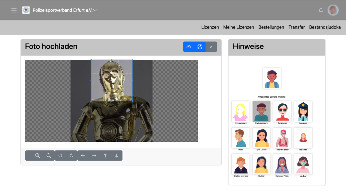 - Passe den Ausschnitt des Bildes an. Auf dem Passbild sollte das Gesicht gut zu erkennen sein. Mehr als der Ansatz des Oberkörpers bis zu den Schultern sollte nicht abgebildet sein.