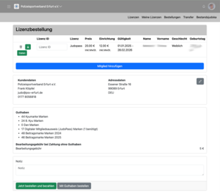Das Bestellen eines neuen digitalen Judopasses ähnelt sehr dem der Zuordnung der Jahressichtmarken/Beitragsmarken. Judopässe werden immer mit der aktuell gültigen Jahressichtmarke/Beitragsmarke ausgestellt, egal wann das Guthaben "Digitaler Mitgliedsausweis (JudoPass)" gekauft wurde.