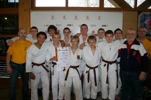 Am vergangenen Wochenende fanden in München die Deutschen Vereinsmannschaftsmeisterschaften der Männer unter 17 Jahren statt. Aus Thüringen waren zwei Teams am Start, die Kampfgemeinschaft SV Schmalkalden 04 e.V. / PSV Meiningen und der PSV Erfurt. Die Südthüringer Kampfgemeinschaft startete, trotzdem sie die unterste Gewichtsklasse nicht besetzen konnte, mit einem klaren Sieg gegen den PSV Berlin in das Meisterschaftsturnier. Der PSV Erfurt unterlag in seinem Erstrundenduell dem JC Mönchengladbach. Im zweiten Kampf trafen die Kämpfer aus Schmalkalden und Meiningen auf den späteren Bronzemedaillengewinner, die KG Backnang/Sindelfingen. Hier unterlagen die Thüringer klar mit 1:5 und mussten in die Trostrunde. Dort wartete der amtierende Deutsche Meister JC Leipzig. Nach spannendem Kampfverlauf konnte die Kampfgemeinschaft die Begegnung mit 4:3 für sich entscheiden und zog so in das Trostrundenfinale ein. Hier hieß der Gegner 1. JJJKC Hassloch (PF). Dieser hatte zuvor den PSV Erfurt in der Trostrunde mit 4:2 besiegt. Die Schmalkalder und Meininger lieferten sich mit den Pfälzern einen harten Kampf. Ohne das Quäntchen Glück mussten sich die Thüringer am Ende jedoch mit 3:3 und 30:23 den Pfälzern geschlagen geben. Platz 5 knapp verpasst, aber dennoch mit Platz 7 sehr zufrieden und Zielstellung erreicht. Herzlichen Glückwunsch! Die Kämpfer der Kampfgemeinschaft: Mathias Bickel, Tom Wilhelm, Danny-Paul Kiel, Steve Wilhelm, Alexander May, Stefan Fleischmann, Sebastian Ullrich (alle SV Schmalkalden 04 e.V.)Dennis Ehrmann, Lindo König, Fabian Ebert, Florian Schneider (alle PSV Meiningen)
