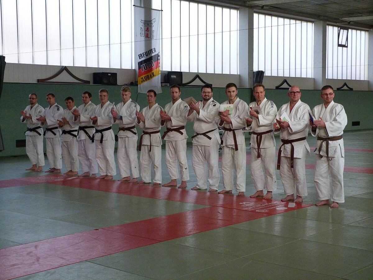 Schon traditionell wird im Thüringer Judo Verband Anfang Dezember die zweite Dan-Prüfung im Jahr durchgeführt. Auch in diesem Jahr stellten sich 9 Judokas der Kommission um ihre Prüfung abzulegen. Das Feld der acht Anwärter auf die erste Stufe war gut durchmischt. So stellten sich "alte" Hasen und "junge Wilde" der Prüfung. Monate lange Vorbereitung und zwei durchgeführte Konsultationen sollten zum Erfolg der Prüfung beitragen.