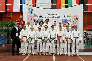 In Judo-Mannschaftswettbewerben gibt es im Prinzip ebenfalls nur Zweikämpfe aber irgendwie ist alles anders. Man steht zu Beginn und am Ende eines Mannschaftskampfes nicht alleine auf der Judomatte, man hat als Team, auch bei einzelnen Niederlagen, eine Chance zum weiterkommen und die Unterstützung vom Mattenrand aus pusht noch einmal. Wenn es schiefgeht muss die Mannschaft zusammenstehen, wenn man Erfolg hat darf man gemeinsam feiern. Genau dieser Charakter eines Teamwettkampfes war am vergangenen Wochenende zum Bundesfinale des Deutschen Jugendpokals in Senftenberg zu spüren. Fast 60 Mannschaften aus dem ganzen Bundesgebiet sorgten für eine fantastische Atmosphäre in der Niederlausitzhalle. Gekämpft wurde in 5 Gewichtsklassen der Altersklasse U14, bei den Mädchen waren auch Kampfgemeinschaften aus zwei Vereinen möglich.