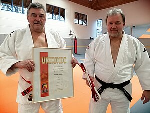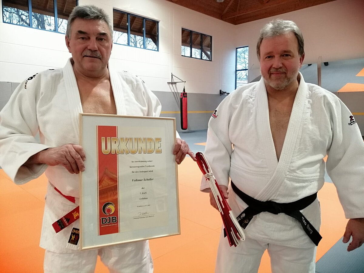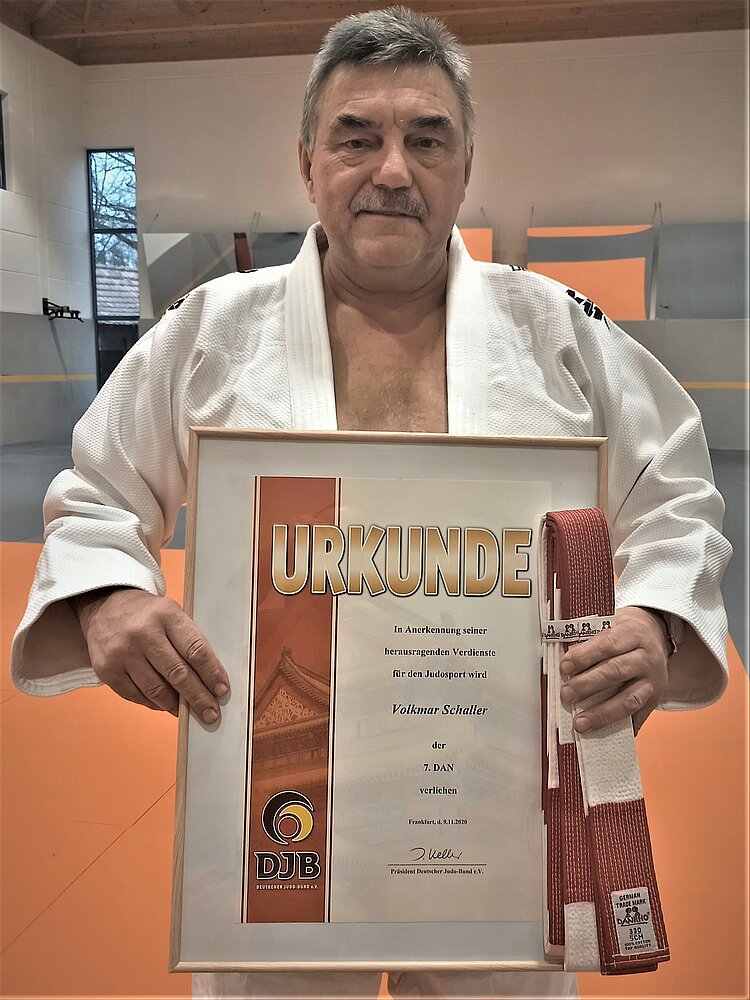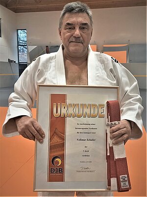 Veteranenteams Deutschlands. Nun überreichte der Präsident des Thüringer Judo-Verbandes, Tino Berg, dem Harpersdorfer eine hohe Auszeichnung. Volkmar Schaller darf sich über die Verleihung des 7. Dan freuen. Die Mitgliederversammlung des DJB gab dem Antrag zu dieser hohen Auszeichnung statt. Nach Charly Peters und Angelika Wilhelm, ist Volkmar Schaller erst der dritte Thüringer dem diese Ehre zuteil kommt.