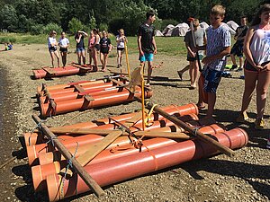 Der Mittwoch lud trotz akutem Schneemangel zum Biathlon. Gewehr bei Fuß musste man seine Ausdauer und Treffsicherheit beweisen. Dabei machten die Mädels am Gewehr keine schlechte Figur. Gesamtsiegerin wurde Leonie. Auch der Umgang mit Pfeil und Bogen wurde geübt. Dort zeigten die Betreuer Andrea und Tobias ihre Fähigkeiten. Sie schossen die Pfeile am besten ins Ziel. Teamarbeit war am Nachmittag beim Floßbau gefragt. Trotz gleicher Ausgangsbedingungen kamen am Ende drei verschieden Konstruktionen heraus, die mehr oder weniger gut im Wasser lagen. Untergegangen ist zumindest keines. Bei bestem Wetter war die anschließende Abkühlung im Saalewasser obligatorisch. Am Abend gab es den Film „Krieg der Knöpfe“ im Openair Kino. Der Kinderfilmklassiker kam gut an und sorgte für kurzweilige Unterhaltung.