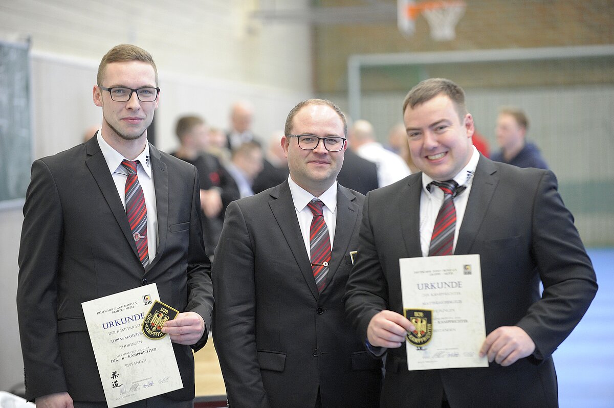 Thüringen darf sich über zwei neue Bundeskampfrichter freuen. Tobias Maultzsch und Matthias Herlitze bestanden ihre Prüfungen zum DJB B-Kampfrichter erfolgreich. Sie tragen ab sofort den Bundesadler am Jacket und dürfen nun DJB Gruppenmeisterschaften und Bundesligabegegnungen schiedsen. Die Prüfung fand im Rahmen der Mitteldeutschen Meisterschaften in Jena statt.