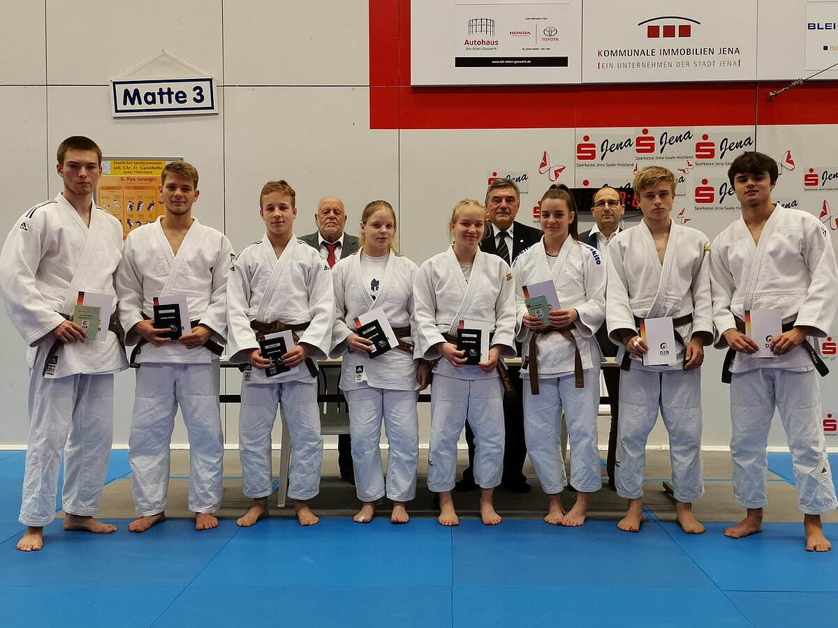Der Thüringer Judoverband gratuliert Lennart Leuschke, Eric Graupner, Lars Nagler, Ole Fünfgelder, Julian Thierstein und Amelie Giller sowie Nina Kleinert und Theresa Fiedel zur Aufnahme in die Reihen der Schwarzgurtträger. Am Landesleistungsstützpunkt des TJV in Jena absolvierten die 8 jungen Judoka am 23. Oktober mit durchweg guten und teilweise sehr guten Leistungen ihre Prüfung zum 1. Dan. TJV-Prüfungsreferent Volkmar Schaller (6. Dan) sowie die Prüfer Jan Steiner (5. Dan) und Lothar Schertel (2. Dan) freuten sich über die vorbildliche Vorbereitung aller Prüflinge und die gezeigten Leistungen der jungen Athleten des Sportgymnasiums Jena.