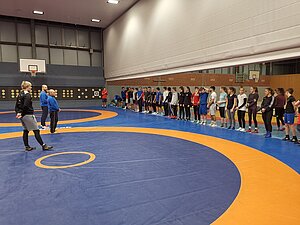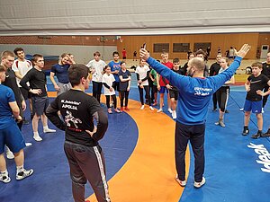 Jena, 10.12.2021 - Die Judoka des Sportgymnasiums Jena standen am letzten Donnerstag bei ihrem Gegenbesuch in der Ringerhalle einmal ganz ohne Judogi und in Strümpfen auf der Ringermatte. Landestrainer Hartmut Reich und Stützpunkttrainer Kay Taubert erläuterten nach einem kurzen Aufwärmtraining den rund 35 Athleten die vereinfachten Regeln für das gemeinsame Kampftraining und vermittelten anschließend auf sehr anschauliche Weise grundlegende Stand- und Bodentechniken aus dem Ringkampf. Judo Landestrainer Jan Steiner freute sich besonders darüber, dass die Judoka mit den aus dem heutigen Judowettkampf seit 2010 verbannten Beingreiftechniken in Berührung kamen und dadurch eine bewusstseinserweiternde Trainingserfahrung machen konnten. Alle Teilnehmer hatten in der zweistündigen Trainingseinheit jede Menge Spaß und freuten sich zum Jahresausklang über die willkommene Abwechslung im Trainingsalltag.