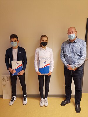 Mit Ronja Klein von den Mattenteufeln Erfurt und Carl Then vom JC Jena wurden vergangene Woche gleich zwei TJV Athleten für ihre Erfolge bei den Deutschen Meisterschaften 2021 ausgezeichnet. Carl Then gewann in Leipzig den Titel in der Gewichtsklasse bis 46 Kilogramm und Ronja Klein erkämpfte sich die Vizemeisterschaft in der Gewichtsklasse bis 48 Kilogramm. Die Ehrung wurde durch den Geschäftsführer der Thüringer Sporthilfe Herrn Arnd Heyman vorgenommen, der die beiden Sportschüler hierfür extra in der Sportschule Jena besuchte. Herzlichen Glückwunsch an die Athleten und vielen Dank an die Thüringer Sporthilfe.