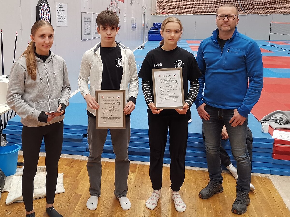 Neben den Dan-Prüfungen legten Martin Deterding (Medizin Erfurt), Roland Lüdecke (TSG Salza), David Ackermann (SV Harpersdorf) und Kassandra Walluks (JC Jena) in Harpersdorf ihre Prüfung zur TJV Prüferlizenz ab.